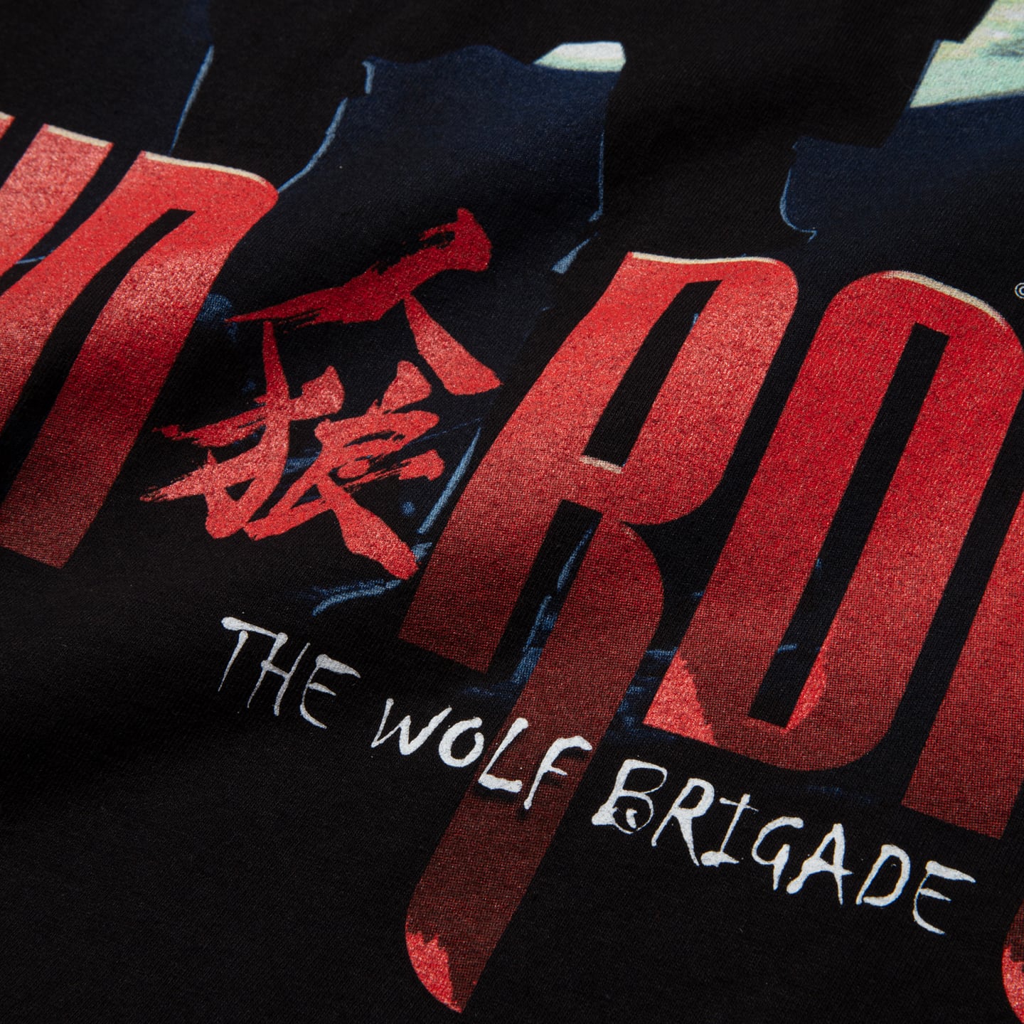 デザインは、『人狼 JIN-ROH』オープニングの象徴的なシーンと特別に海外版のロゴを組み合わせ、黒ボディを最大限に活かしました。プリントは、90年代のアメリカラバーインクと同じ質感のインクを使い、大型自動回転印刷機で合計12版刷りしたシルクスクリーンプリント。