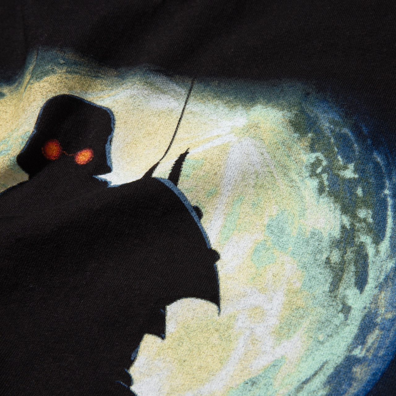 背後に大きく輝く月は多色で繊細に表現し、青い月明かりでキャラクターを立体的に浮かび上がらせています。キャラクター部分は90年代アメリカのTシャツに多用されていたブラックマジックを取り入れ、見た目や手触りにも拘りました。